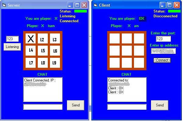 Private Sub L1_Click() If player = "X" Then L1 = "Player:X" turn.Caption = "O" If player = "O" Then L1 = "Player:O" turn.Caption = "X" Winsock1.SendData L1 'šalje akciju na jedan klik u client End Sub Code:
