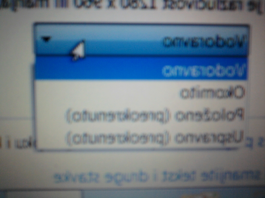 Rezolucija je mala, zato što kada stavim na normalno ne može se čitati, jer su premala slova, a ne znam di je sve napamet. Napisala sam već da Crtl+Alt+strelice ne rade,a kada se u Graphics Optionu mijenja rotacija slika se rotira,ali je i dalje obrunta, slova su naopako, sve je umjesto normalnog s desno na lijevo, obrnuto s lijevo na desno. Znači vjerojatno je grafička? Laptop više nema garanciju, a grafička je integrirana, što znači da je spreman za recikliranje... Možete vidjeti na ovoj slici, da je čak i strelica miša okrenuta suprotno. ![]() Zadnje izmijenjeno od: nino. 24.08.2013. u 14:10. |