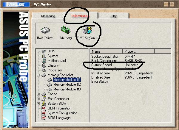 Kako imas Asus plocu, i instalirao si PCprobe, probaj vidjeti dali iz njega mozes vidjeti brzinu RAMa. Npr. na mojoj TUSL2-C PCprobe v.2.23.01 ne cita brzinu, ali na P4 plocama uglavnom radi (ne uvijek). Ako nemas instaliran PCprobe, onda ponavljam savjet masnog: cpu-z