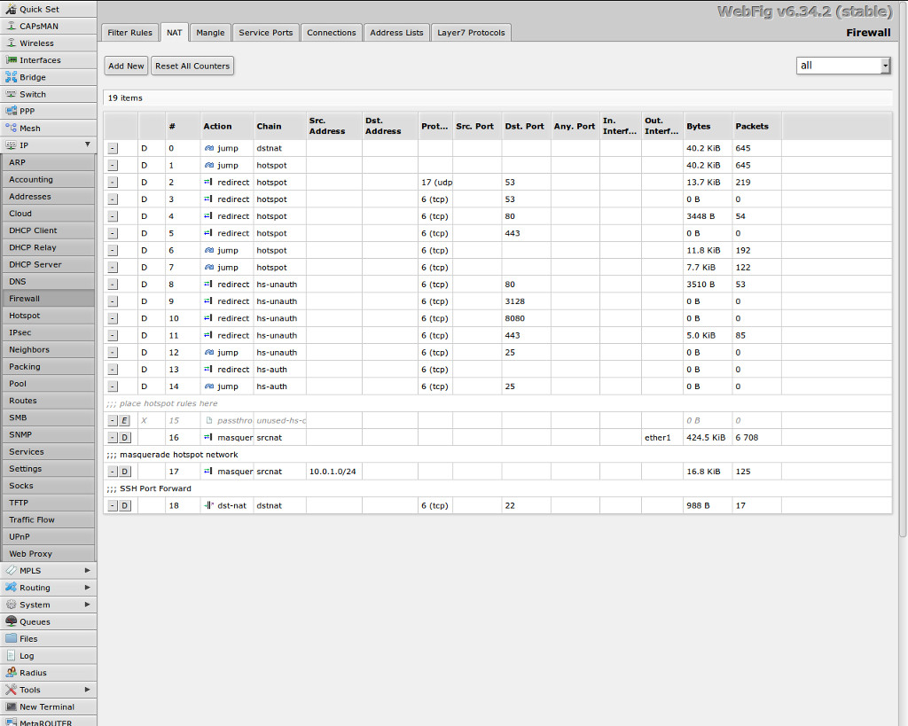 port 22 koliko vidim blokao si za brute force.. od svuda normalno da nit z lana nebres u njega disejblaj to pa probaj isto tako portforvard... stavi interface out interface koji.. recimo taj NET pppoe isto pokušaj za hotspot i port 80.. pa onda nebude od bilo kuda port 80 išao na tamo kamo si ti to prosljedio i koristi winbox jednostavnije ti bude |