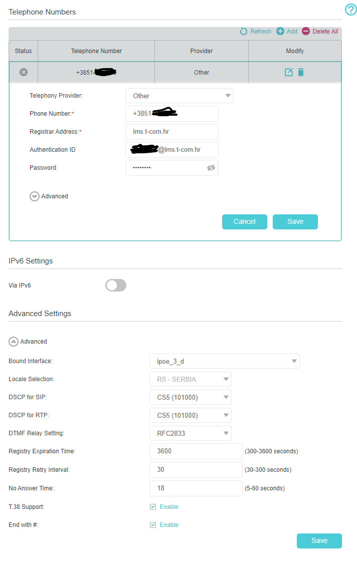 Pozdrav svima, Proučavajući forum na kraju sam se ipak odlučio za varijantu main routera TP link VR2100V (EU) koji ide direkt u ONT, a nakon njega 2 TL-SG105E u trunku za MaxTV kroz jedan kabel. Nakon konfiguriranja super radi taj dio za MaxTV koji radi već par dana bez prekida. Internet je Optika i ide do 930/500 tak da je to isto ok, kroz TL-SG105E ostale portove. Wifi je isto ok za sad. Uzet ču još 2x RE650v2 za prizemlje i podrum te ću ih spojiti direktno na kabele koji idu u VR2100V i riješio sam internet za te katove putem AP (mogu probat OneMesh prije toga pa ako nevalja prebacim na AP.) Međutim ono što imam problem je dignuti VOIP na VR2100V. Postavke su niže u prilogu za Internet i dvije varijante za VOIP VLAN + postavke pod "telephone". Ako stavim static IP onda pod Internet doduše piše "connected" ali u System Logsu javlja "every IP of the domain has been tried, but we didn't find the correct one!" odnosno "account[+3851xxxxxxx(0)] registration failed" ;"register fail, response code(503)". Ako stavim dynamic IP onda pod Internet vrti da se connectira, a u system logsu ide nešto tipa“ send DISCOVER… recv OFFER from server… Offered address is in use, Send decline“ i tako samo diže po skali IP adrese. Ja sam šifru za VOIP dobio oko Božića, jel moguće da je mijenjana? Hvala svima na odgovorima i lp. |