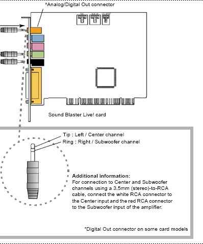 Taj zadnji - narancasti je S/PDIF. Tj. koaksijalni digitalni izlaz. Mono banana na RCA (cinc) preko 50/75 ohmskog koaksijalnog kabla, iako nemora strogo koaksijalni, radi i sa obicnim. Nikakva optika. Preko njega ide digitalni stereo, ac3, dts ili kakav vec signal koji se onda u receiveru dekodira. Ili ako iskljucite ac3 passthru, uvijek sve downmixano na stereo. Kad se koriste analogni izlazi, onda se tu ja mislim spaja centralni ili LFE zvucnik, nebi znao tocno jer koristim samo taj spdif i nis vise na tom smecu od zvucne ... ![]()