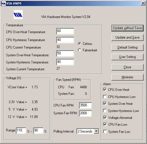 Athlon na 1 GHz (bez OC-a), bez opterećenja 43, sa opterećenjem 48 stupnja. hladnjak: Volcano II kućište: noname, sa samo jednim ventilatorom (napajanje) na 36 stupnja, sa opterećenjem se digne na 38. |