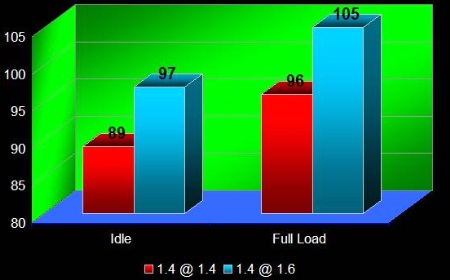 Temperatura je ( kako piše) izmjerena nakon 45min. igranjaWolfia u rezi 1600x1200 sa svime na max. Temperatura okoline je 20,55555556 C. Crveno je temp na 1,4 a plavo na 1,6GHz. Sad sam i ja našao calculator na kojem piše kako pretvofiti F u C ![]()