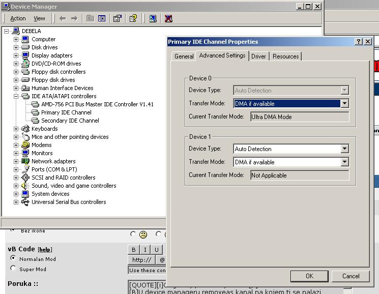odi u: 1)control panel 2)system 3)odi na tabulatoru hardware i stisni "device manager" 4) nadji ide/atapi kontroler kao na slici i klikni za kanal "primary ide channel" properties..i onda ga promjeni u "DMA if available" na svim kanalima gdje nije tako..onda odi na "secondary ide channel i promjeni sve u "dma if available" i na kraju reset compa i provjeri da li ti je primio sve ove naredbe tako da odes opet u te menije i pogledas vrijednosti koje pisu pogledaj na slicici tu...nadam se da sam pomogao.. |