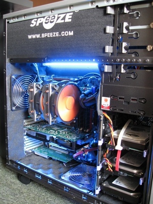INTEL C2D E6600 2.4 OC NA 3.0 GHZ,GIGABYTE P965 DQ6,4X1GB KINGMAX 830 MHZ,GAINWARD 8800 GTS 512 700/2000/1650,MAXTOR 320 gb,MAXTOR 250 gb,SEAGATE 120 gb,TAGAN 530W,LOGITEC G5,BENQ 19"LCD thermaltake sonic tower sa 2 thermaltake 13 cm ventilatora( za sonic tower),dodana originalna bočna stranica sa prozorom ,unutrašnjost ofarbana u crno,izrezana rupa na dnu kučišta za 12 cm vent,izrezana zadnja mrežica za ventilator na kučištu,dodane metalne mrežice na ventilatore,cijela unutrašnjost obložena spužvom,plave neon lampe,zalman fan controler s kojim se kontroliraju svi ventilator.komentari i prijedlozi poželjni!lsike su dosta male,pa je dodan link gdije se mogu pogledati u većoj rezoluciji. link:http://www.techpowerup.com/gallery/1213.html ![]() Zadnje izmijenjeno od: zvonjola. 02.08.2008. u 16:11. |