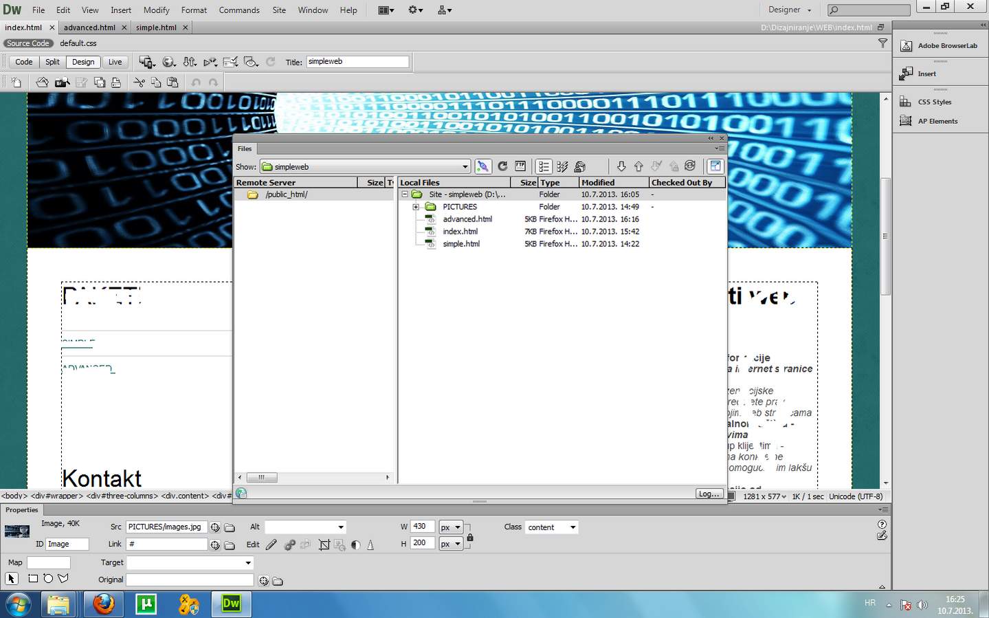 pozdrav ekipa imam jedno pitanje i problem napravio sam stranicu u DREAMWEAVERU i kada testiram stranicu u WEB BROWSERU stranica mi je SUPER ali nastaje problem kada je UPLOADIRAM na server izgube mi se sve KOLONE, STUPCI , SLIKE i vas REDOSLJED i sve izgleda bezveze što sam napravio a neznam ZAŠTO ??? i u čemu je stvar hvala na odogovoru |