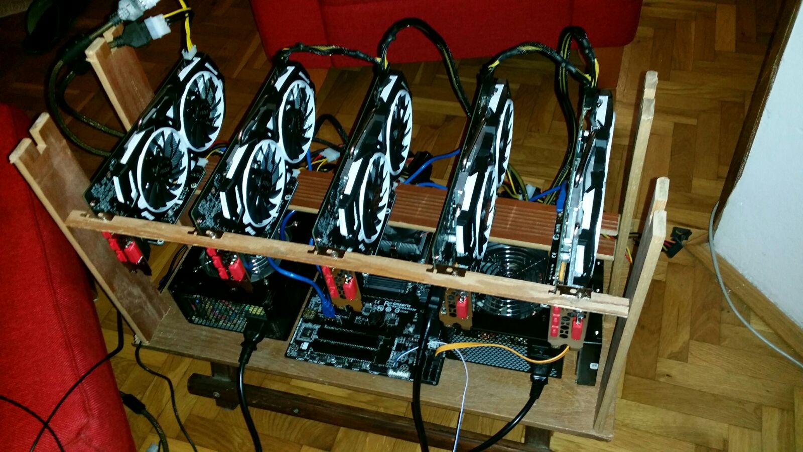 Dok kolega mejimurec gore ima police, ja moram imat klimu. Radi se o 5X RX 570 Asus i nisam zadovolja. zato i treba ova klima da duva u njih, jer inace ili je ventilator na 100% ili ej temperatura na 70 Celziousa. Sad s klimom je Ventilacija u prosjeku na 60%, a temperatura na 65 Celziousa i to dok klima duva u njega na 17 Celziousa, nemozes vjerovat... Radi cca 140 MHS na Ethashu Struje trosi cca 800W AMD Processor je neki gore, i 4GB Rama, ploca ona Gygabite za 5 graficki najpopularnija, neznam tocno sad sifru. Napajanja su razlicita. Corsairs 600 i EVGA 750, morao sam kombinirat s drugim rigovima napajanja jer ova corsairs 600 nemaju dovoljno PCIe. imaju samo 2 utora. Probao s converterom, za tjedan dana se converter osmodio.