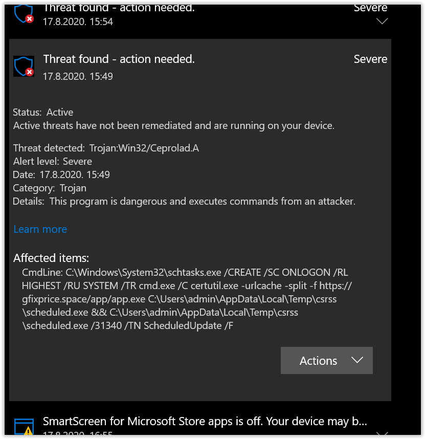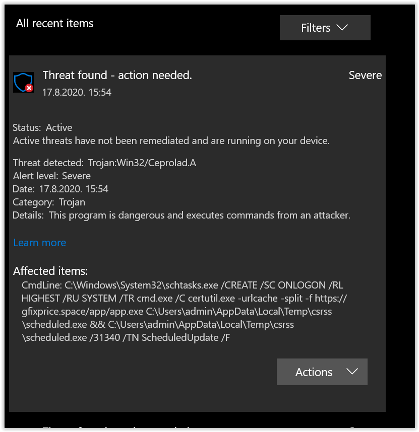Pozdrav! Jutros na kompu uletio nekakav smrad. Zove se WUP.EXE (vidi slike). Našao sam ga u appdata\local\temp ali nakon ručnog brisanja i restarta se ponovo pojavljuje. U task manageru servis svchost zakucava proc na 100%. Ručno ga mogu ubiti, no nakon restarta ponovo ista priča. Projurio sam reg. cleaner, AdwCleaner, JRT, Rkill, SuperAntiSpyware no bez uspjeha. Isto tako windows defender ga vidi, ali ga se ne može staviti u karantenu. Svaki put se ponovo pojavi. CLOUDNET.EXE sam uspio ručno izmercati brisanjem iz temp. Dali neko zna kako ovo riješiti?