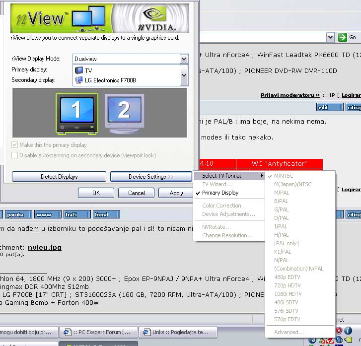 Stavi da ti je TV kao secondary display. Onda samo klikneš na TV (br. 2) i onda ti ne bi smijelo biti sivo. Probaj da niti ne uključiš signal prema njemu nego ga konfiguriraj prije enejblanja TV-OUTa Pretpostavljam da si skinuo od negdje modani bios, pa ti je zato default NTSC Trebao si paziti i u nibitoru izabrati PAL, a ne NTSC ako je slučaj sa biosom...