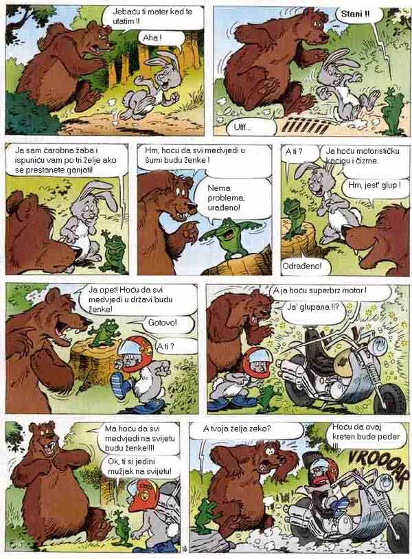 ovo znam kao vic sa zekom i medvjedom, bilo u jedno broju playboya, ali ova ženska je totalno glupa zakon garant nekakva plavuša ![]()