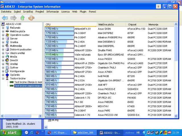 Evo nakon sto sam napravio vdd mod na ploci, potero sam sabiricu skupa s memorijom na 233 (466) i to s postavkama 3 - 3 - 3 - 11 pri 2.9V i dobio ove rezultate AIDA32 (read):