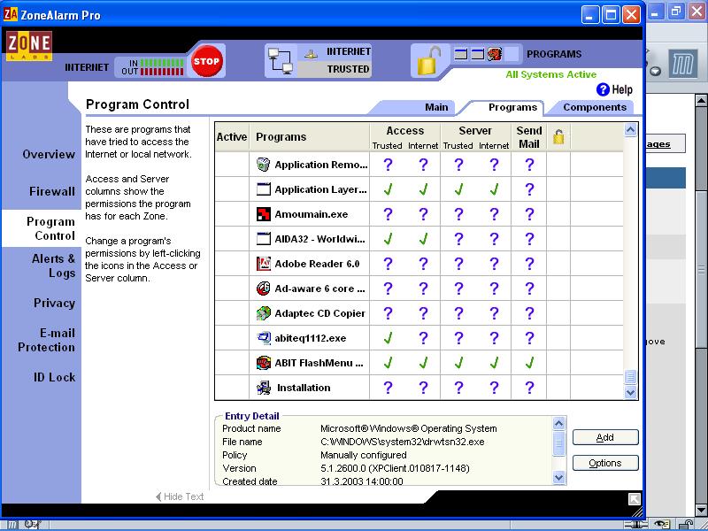 Nakon kaj je meni dopizdilo s time da jedino meni Flash menu ne dela da nemrem javu instalirat i ine pizdarije ja odlučio na kratko isključit ZA i vidi vraga sve dela. Ručno sam pošetelao da Flash menu ima izlaz na net kao i Java installer, ali ne ZA ima druge ideje i uredno blokira povrtanu informaciju. U Attachu je capture s postavkama za program control pa molim sugestije kak da ga poštelam da mi sve dela.