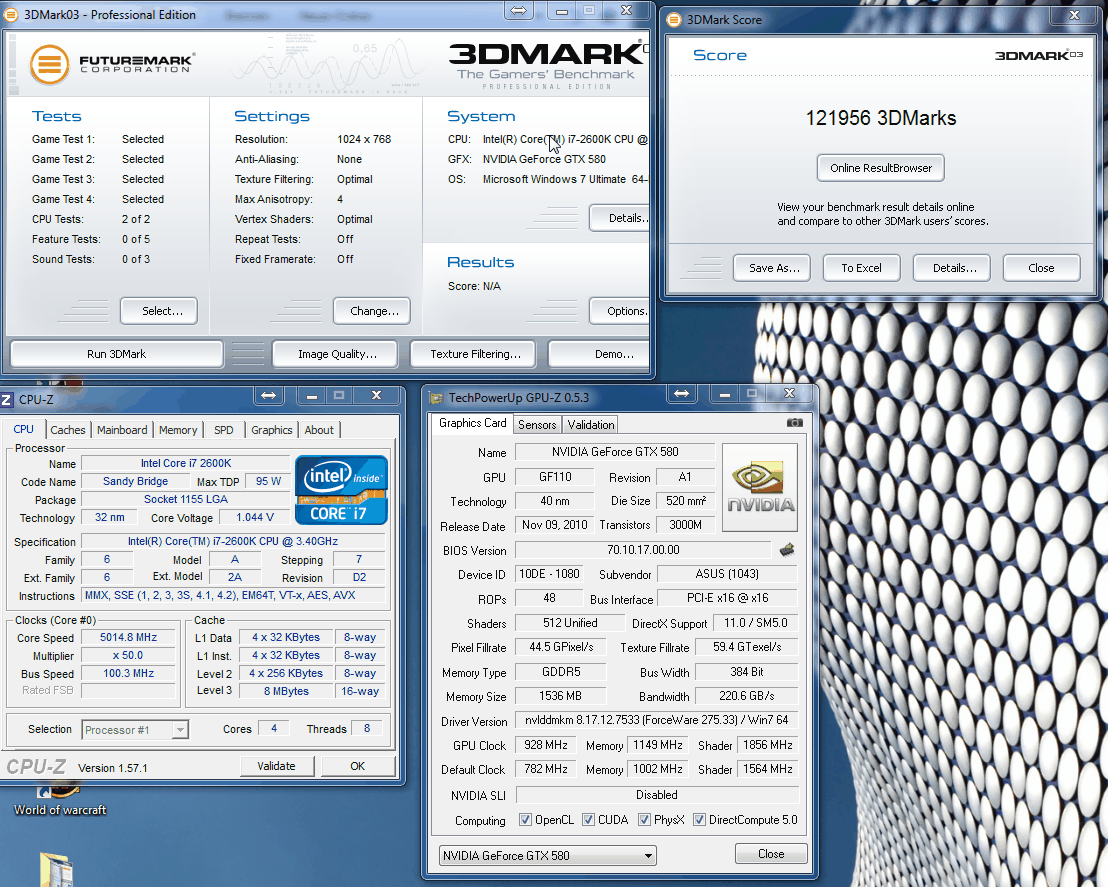 Srecko_83 - 121956 | GTX 580@ 928/1149/1856 , zrak |Core I7-2600K @ 5GHz , Corsair H70 Stigla nova grafa ASUS GeForce GTX 580 Direct CU II Operating system 64-bit Windows 7 (6.1.7600) Motherboard Gigabyte Technology Co., Ltd. Z68X-UD7-B3 CPU cooled by Corsair H70 Intel Core i7-2600K Processor @ 5GHz Memory 16384 MB Graphics Card NVIDIA GeForce GTX 580 @ 928/1149/1856 121956 3DMarks http://3dmark.com/3dm03/6416305