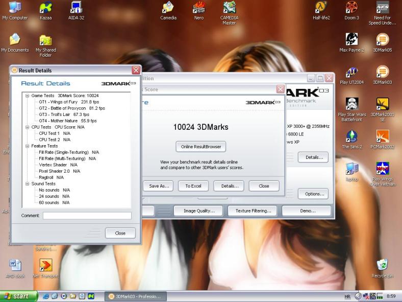 10048 bodova 2003 kako je rekao netko...kartica ide ko gluha kokoš, ali driveri...koče !! s onim provjerama niti jednog jedino artifekta ili trzaja za sada ostavil ju budem na tih difultnih 400/900 .....neka bude okruglo... |