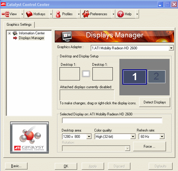 Dobro da sam nabasao na ovaj post! Ja ima problema sa spajanjem, situacija ista, spajanje lcd-a i laptopa putem vga kabla. Grafička Ati Mobility Radeon HD 2600. Kada ih povežem isto mi se desktop pojavljuje na tv-u i jedino to, ali želim gledati filmove, you tube sa laptopa. Izgleda da sam napravio Extended ali i Clone na driverima od grafičke tj. ne znam ga napraviti. Može li mi netko u mom slučaju pojasniti korake kako se prvilno spaja tv i laptop i podešava u postavkama windowsa i grafičke Ovako to izgleda. |