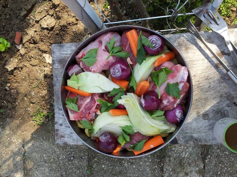 oprao domaće batake čikena (koliko domaći mogu biti) i bacio u pac od maslinovog, limuna, krupne paške soli sa dalmatinskim začinima, timjanom i paprom. u protvan nabacao narezani mladi krumpir, cijele češnjakove, šparoge, svježi vlasac, peršin i ružmarin (iz vrta, sa paga grm), ista ta sol, papar, maslinovo i još malo prelio sa pacom od čiketine. prvo malo zapeko da se sve "posuši" i onda folija jedno 40 minuta i sada idem istu skinuti i zapeknuti pošteno. ![]() |