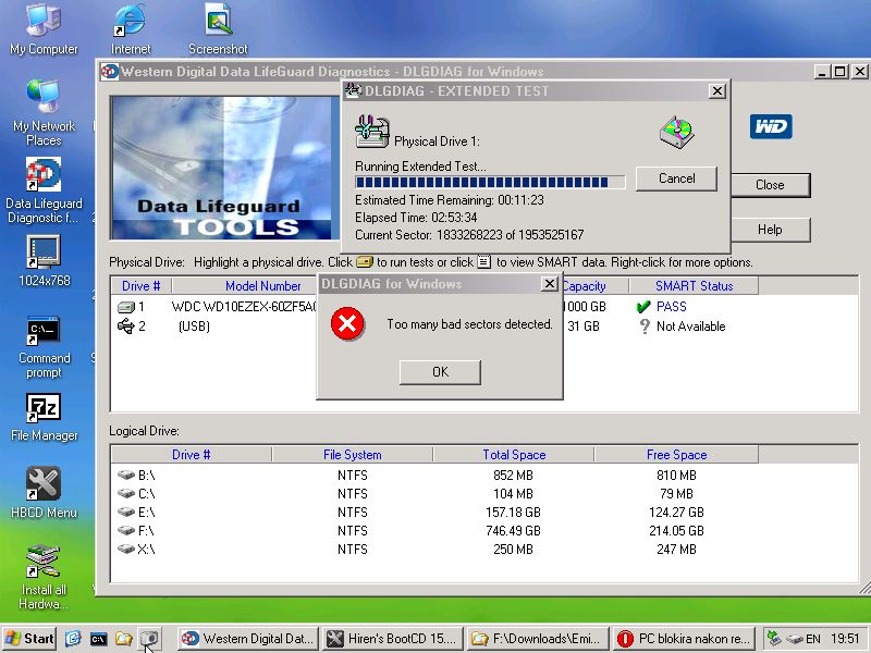 napravio sam brzinski test hd tune/om i disk je bio ok. Sad sam instalirao wd-ov i nakon 2 sata sada je zapeo vec sat vremena na ovom sektoru sto ce vjerovatno ispast bad sektori... Edit: Izgleda da je disk pun bad sektora... Disk je star nažalost samo par mjeseci ali nema garancije... Cime najbolje pokusat popravit bad sectore ? HDDRegenerator ? Zadnje izmijenjeno od: iko222. 04.11.2013. u 20:54. |
