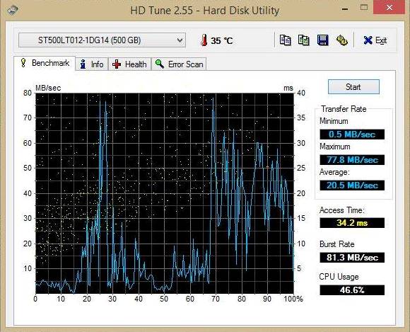 Da odmah spašavam sve s njega? Ili kako da mu pomognem? Na istom računalu Seagate 120GB storage disk radi normalno tj. ima normalan read graf. Prvi put vidim ovako čudan disk. Probao sam dva alata i oba daju isti read test, ovaj: