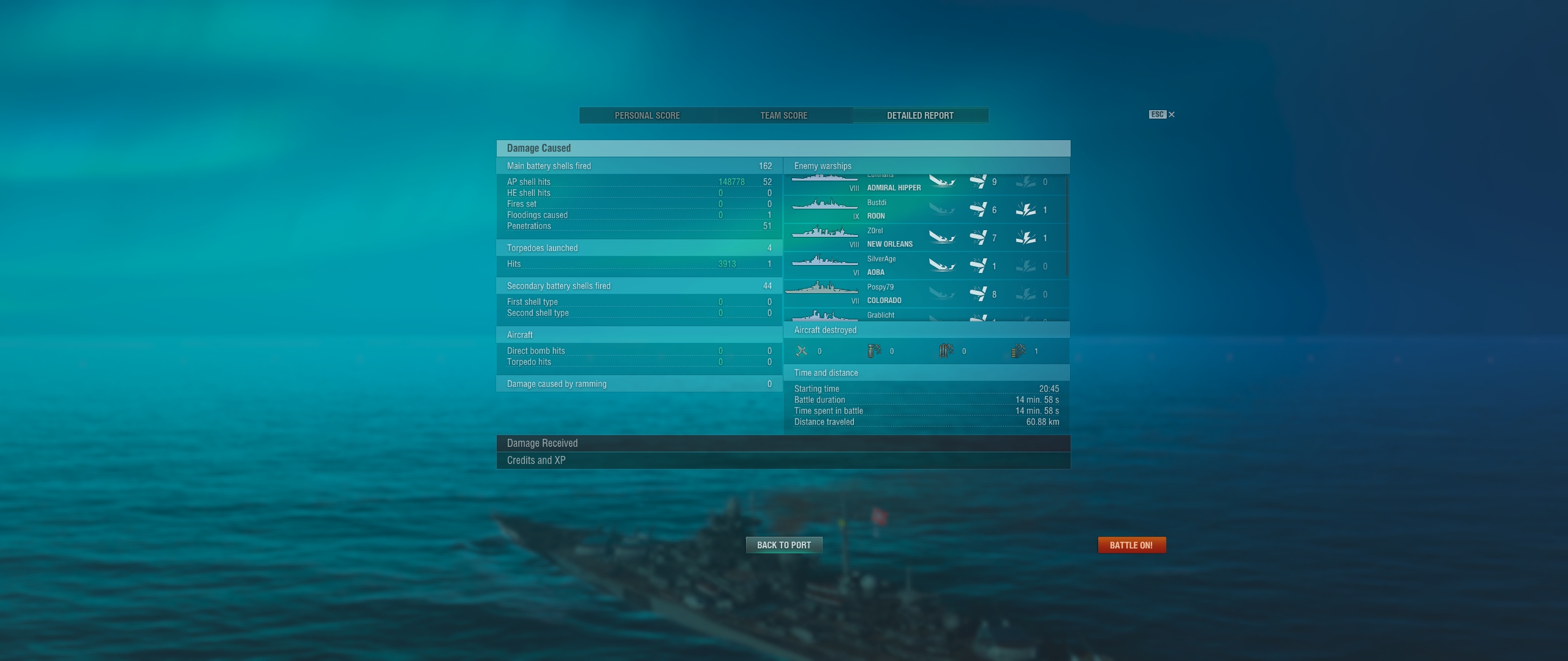 Odlična bitka sa North Carolinom. Timski rad do jaja koju sam imao sa 3xCA. Skinuo ih 6 komada, skinuo sa jednom salvom full HP Atlantu, a kasnije malo načetog ARP Myoko-a isto iz prve koji je htio Cap-ati bazu Za kraj, bliska borba sa protivničkom NC-om koju su završili moje sekundarni topovi jer mi nije htio imalo pokazat bok unutar 5km kod zadnje salve - mislim da se je išel zabit u mene ![]()