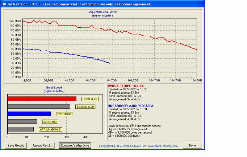 Evo ja sam upogonio raid 0 sa dva hitachija od 80gb sata2.0. Zanimljivo je da su diskovi dosli tvornicki podeseni na sata150 te sam ih morao sa hitachi tool-om osposobiti za sata 300. Isprobao sam HDtach sa tvornicki podesenim diskom i performanse su mu bile normalne za takav disk znaci 133mb burst i 48.8mb read. Kad sam ga osposobio za sata300 burst je skocio na 221mb. Sad imam raid0 pa pogledajte sami rezultate.:burn: PS. da ponovim sata2.0=sata300