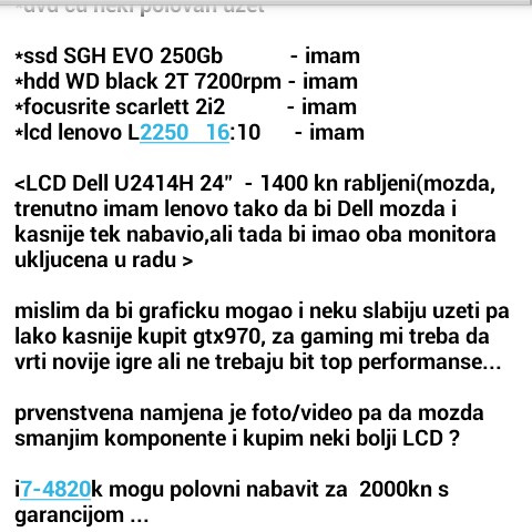 hm......... da. sada si gledam da li se ikako isplati onda ici na jeftiniji http://www.bbt.si/dell-precision-.7513 , pa ubaciti nvidiju novu unutra? generalno pitam jer ovdje dolaze OS-ovi, sto je plus. nakrcano ramima, 8 fizickih jezgri, sve ustemano od Dell-a........ ne znam, nisam pametan. inace, jaca konfa je sada ovakva ispala: ASUS X99-A/USB 3.1 Intel® Core™ i7-5820K Cryorig H5 Ultimate 4 x Kingston Technology ValueRAM 8GB DDR4-2133 Gigabyte GeForce GTX950 Windforce SanDisk Z400s SSD 256GB 2 x Seagate 4TB HDD SATA Barracuda, SATA, 4000 GB Zalman Z3 FSP/Fortron Aurum S 500 Hannspree Hanns.G HQ271HPG 27" Crno, Metallic Copper 2K Ultra HD Gloss plus W7 64bit naravno, ENG. zajedno sve ispada ~16200 kn.
