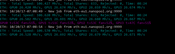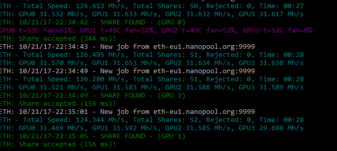 Sa ovim postavkama core 1249 i memory 2183 sam dobio najbolje rezultate što se tiče odnosa hashrata i stabilnosti rig-a. Probao sam točno i sa ovim postavkama core 1100, memory 2100 isto se ruši i Claymore 10.0 i 9.8. Još ću probati dodati na kraj -cvddc 950 (pretpostavljam da je to za underwolt). Radi se o grafikama: 2x Gigabyte RX480 sa Hynixom i 2x MSI Armor RX470 sa Samsungom Zadnje izmijenjeno od: ivicakus. 11.10.2017. u 13:34. |