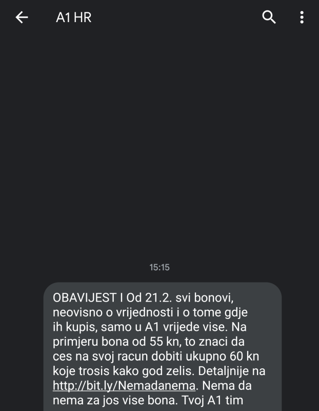 Upravo dobio od A1 poruku da od 21.02. "bonovi vrijede više". Na primjer, za bon od 55 kuna će se dobiti 60 kuna na račun. EDIT: Izgleda da je to promotivna ponuda preko web shopa, nisam siguran da li to vrijedi i za fizički kupljene bonove. |