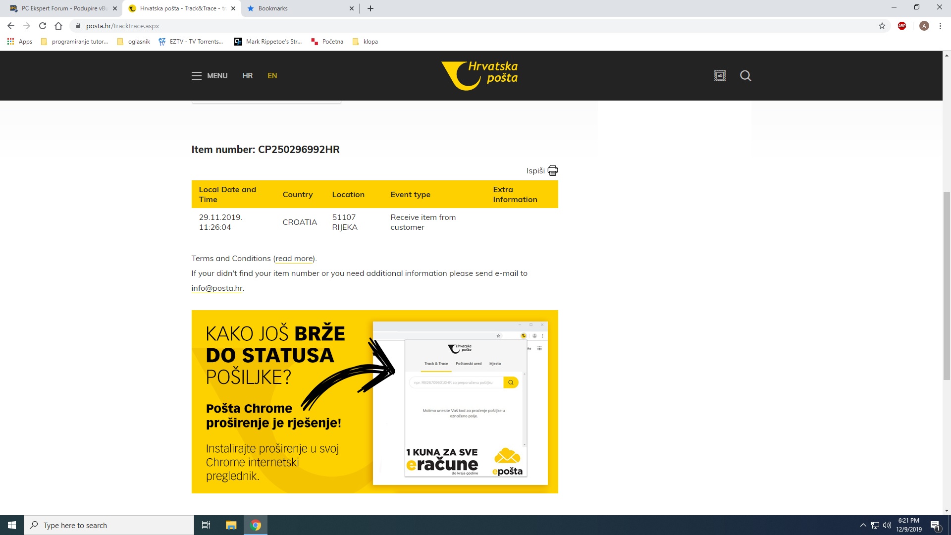 tracking number od orangeconnex.com funkcionira dobro i paket je dostavljen, onako kak je pisalo na njihovoj stranici. međutim imam jedan drugi problem sa našom poštom... poslan mi je paket sa pošte koja je udaljena 15km od mene. paket je poslan u utorak, i to se može vidjeti na stranici od pošte kad unesem broj pošiljke... danas još paketa nema.... a kod statusa samo stoji kada je paket zaprimljen u toj pošti.... zovem svoju poštu, i ženska provjeri po broju pošiljke, da je paket otišao u veliku goricu glavno skladište.... ![]() znači na skroz drugu stranu grada.... i veli da je rok 5 dana da se dostavi, znači ako u ponedeljak ne dode, onda moram opet zvati da se vidi zašto nije dostavljen... ali neovisno o tome, kakva je to logika da nisu paket dostavili direktno na moju poštu sa svim drugim paketima, nego prvo u veliku goricu, pa opet nazad... osim toga zašto evo sada već tri dana paket stoji u velikoj gorici... |
