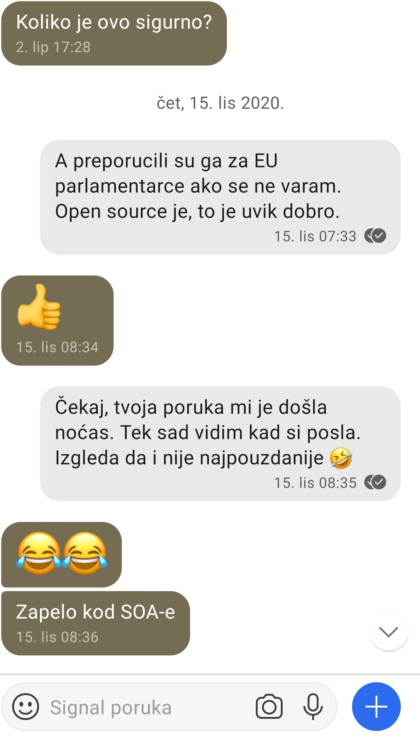 Evo jedno moje dopisivanje preko Signala, pogledajte datume poruka. Nadam se da su to popravili ![]() |