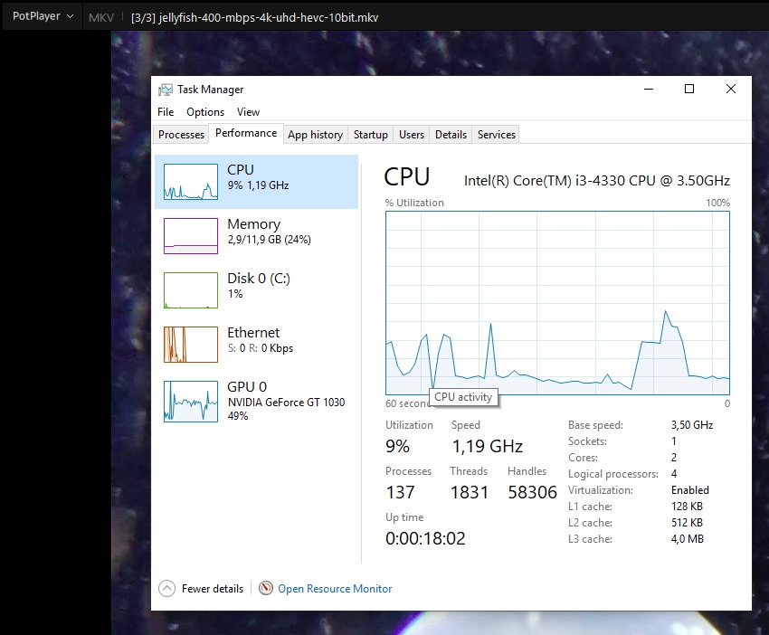zz s obzirom na more oprečnih informacija online, pitanje za ekipu koja je složila 4k htpc oko gt1030 jel dovoljno jaka za ovo? Format : HEVC Format/Info : High Efficiency Video Coding Format profile : Main 10@L5.1@High HDR format : SMPTE ST 2086, HDR10 compatible Codec ID : V_MPEGH/ISO/HEVC Duration : 1 h 53 min Bit rate : 49.6 Mb/s Width : 3 840 pixels Height : 2 160 pixels Display aspect ratio : 16:9 Frame rate mode : Constant Frame rate : 23.976 (24000/1001) FPS Color space : YUV Chroma subsampling : 4:2:0 (Type 2) Bit depth : 10 bits Bits/(Pixel*Frame) : 0.249 Stream size : 39.4 GiB (89%) Default : Yes Forced : No Color range : Limited Color primaries : BT.2020 FuryX mi nema adekvatni hevc decoder nego forsa preko procesora pa ga prikolje plan je ubacit gt1030 kao sekundarnu grafu samo za 4k telku ili ipak uzet gtx1050? |
