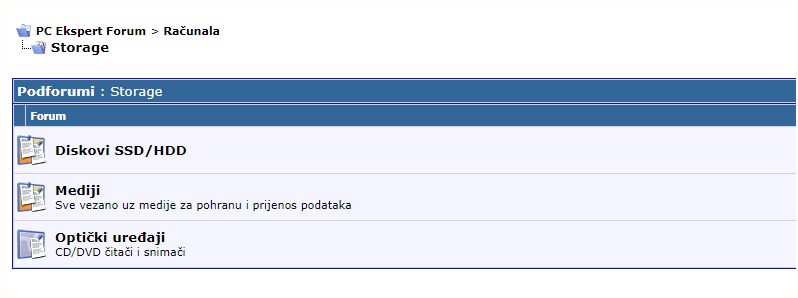 Ma cak ni ne, jer su teme razlicite a nema ih previse. Vec samo da je ispod tih podforuma prebaciti threadove i dopustiti njihovo otvaranje. Tako je trznica poslozena recimo, Gaming podforum isto. Tako da te specificne teme budu u root-u storage podforuma. EDIT: Citiraj: