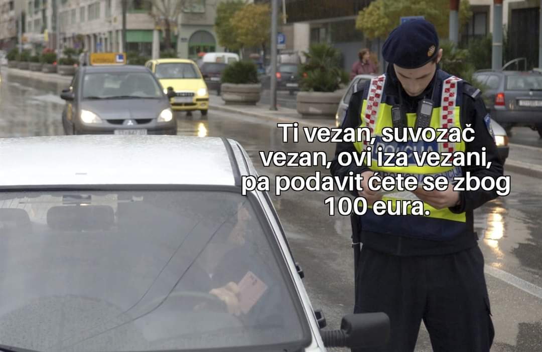 Imao sam situaciju, voze se ispred mene, dolazi veliko krizanje, oni desno ja lijevo, nakon 200 metara iza mene su. Skrecem na veliki parking i trazim parkirno mjesto, pali se rotacija kao da sam kriminalcina i ja stajem.Pita me vozacku i prometnu te dal sam konzumirao alkohol, kazem jesam, te ga pitam zbog cega ste me zaustavili? Kaze on, da sam prosao kroz zuto, laze. On je morao proci kroz crveno te napraviti zabranjeno okretanje preko prometnog otoka da bi se stvorio meni na guzici. Na to zuto kazem da nije istina, te da cu puhat, napusem 0.2 te kazem zasto me zaustavio iz cista mira te da mi da ime prezime i broj znacke. Pandur poludio jer mu je to udarac na ego, ali je dao. Uglavnom prijavio ga unutarnjoj kontroli i to je to. Najgora kazna mi je da mi dijete jednog dana ode u policiju ili novinare.