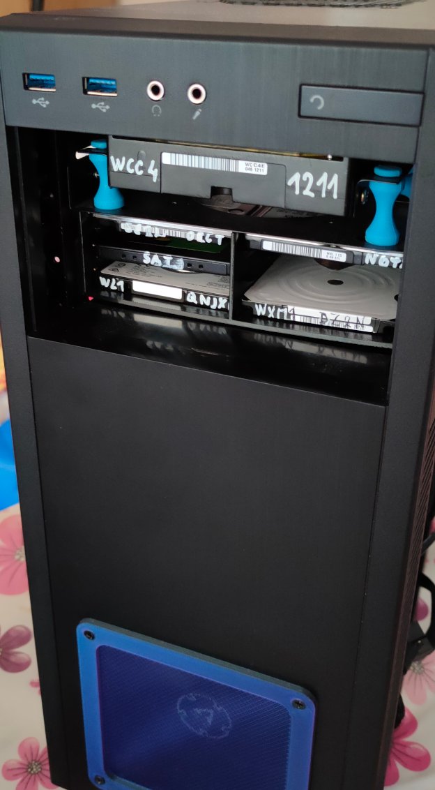 Ma kakvi clusteri... Svojedobno sam dobio desetak vanjskih USB-SATA kućišta s 1-2 TB diskovima koji su služili za backup, neki sa samo par radnih sati, mix HDD i SSD. Bilo šteta za baciti pa je složen jedan takav projektić koji je u međuvremenu rasformiran, ali radio je čisto ok, čak sam i OMV digao gore da bude klik-klik sučelje ![]() 3D print 6x2.5" u 5.25" slot ![]() Dolje case ima standardno 4x3.5, tu su isto isprintani 2x2.5" u 3.5" adapteri. Naprijed 2x P12 PWM +1 otraga, ali je nešto slabo vuklo pa se nabrzinu napravila rupa ubodnom pilom i mrežica za prašinu ![]() Da ovim mališanima ne bi bilo dosadno, gore i dolje su bili po jedan 3.5" WD Red. Nemam sve fotke jer nije više u pogonu, hw se mijenjao s AMD na intela, ali ukupno 6 diskova na adapteru je bilo + 6 na MBO konektorima. Boot s m.2 nvme. To je bilo onako budget rješenje od ostataka hardvera doma - mATX ploča i ne preveliko kućište. Onako odoka, u taj case bi išlo 10x 3.5" SATA sigurno s još jednim kavezom naprijed. Samo se moliš poslije da ne crkne neki disk jer ima posla za to raskopati ![]() |