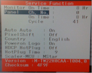 evo kak se moze provjerit panel na novim revizijama monitora koje nemaju napisan kod na naljepnici: smanjit kontrast i brightness na 0,izac iz menija,ponovo uc i drzat predzadnju tipku odozdola 5 sekundi(dok se ne pojavi service menu na ekranu). predpostavljam da ja imam samsung panel po ovom? predzadnje slovo mi je A. |