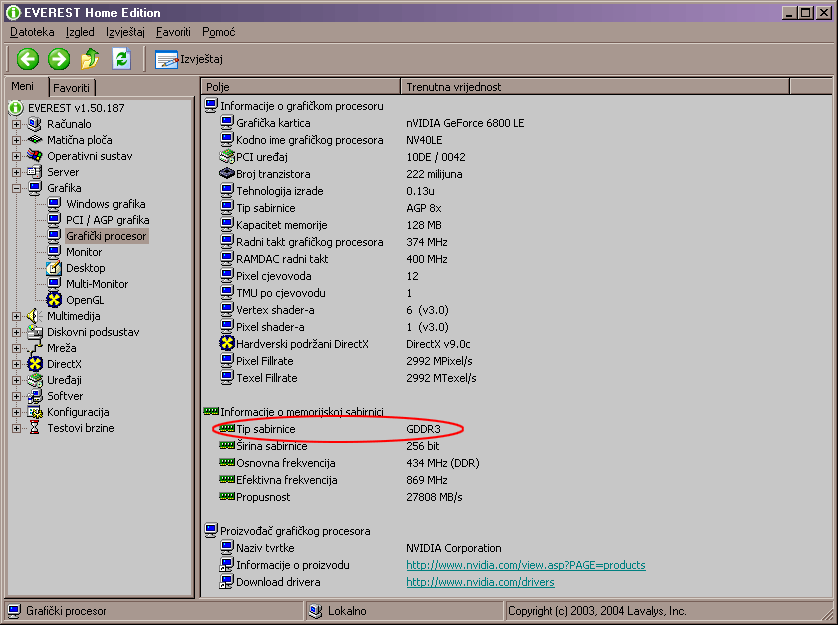 Nikako mi ne ide u glavu da Everest uporno prijavljuje memoriju kao GDR3 !', na Gainwardovoj 6800LE propusnost je oko 25kbps... kako otkriti bez da skidam hladnjake ?...ima li kakav mem tester i identifer za video memoriju ? |