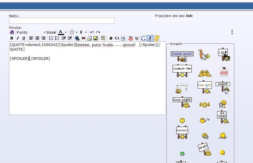 da probaš sa (spoiler) (/spoiler)? Samo u uglate zagrade? ![]() http://forum.pcekspert.com/misc.php?do=bbcode |