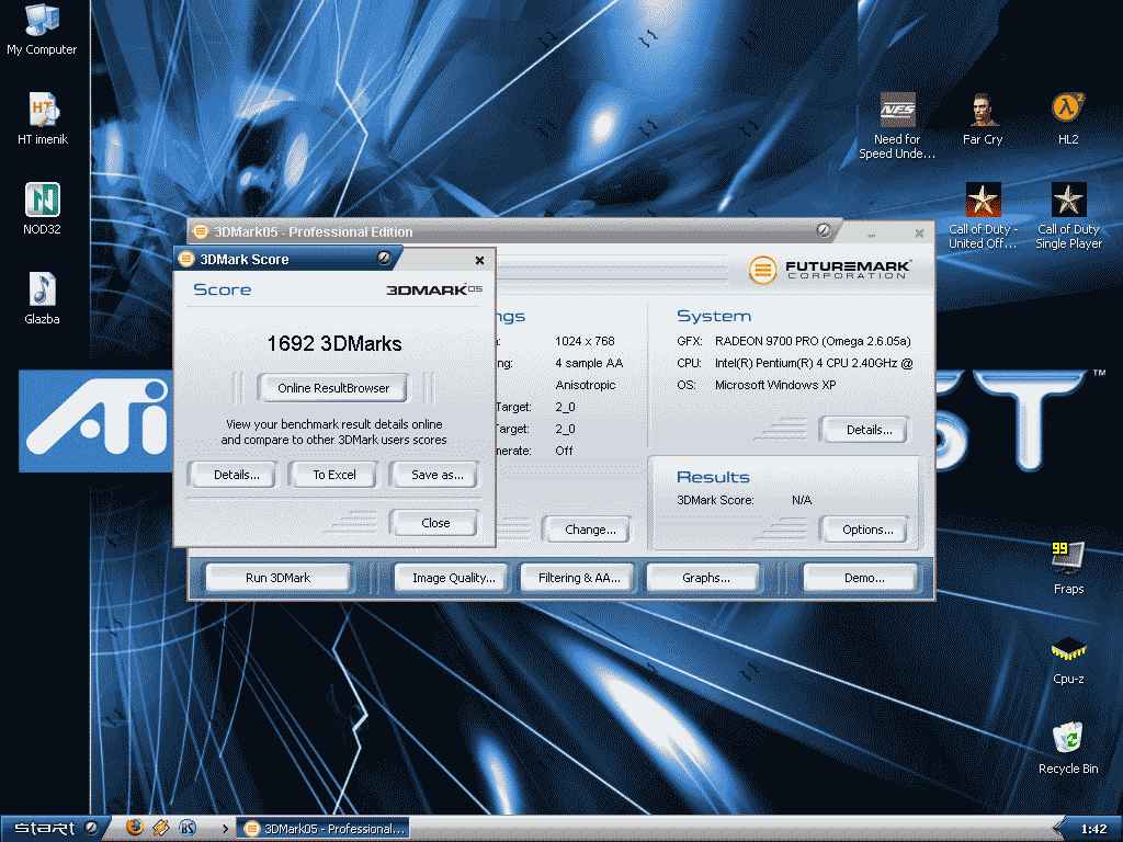 ...uh...vreme je da skinem poster "SEVE in action" , i zamjenim ovom slikicom... zanimljivo kako nitko od ATI konzumenata nije niti pokušao postaviti rezultat... valjda se bude netko sjetio, da testira 9800PRO ili jaču, da malo usporedimo |