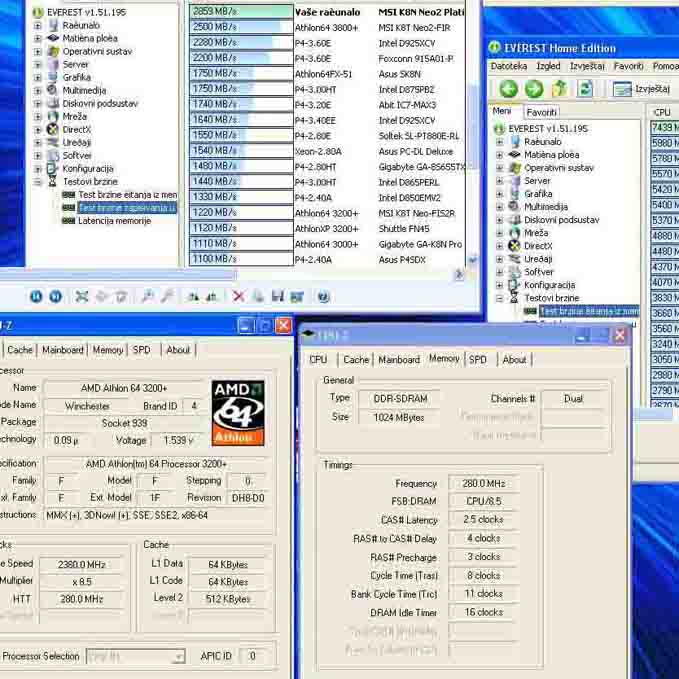 everest 1.51.195 home: citanje: 3229 pisanje: 1303 latencije: 76,1 memorija u sigu (radi na 2-2-2-5) e sada mi nije jasno kako disturbed ima bolje rezultate od mene kad mu memorija radi na nizoj ferkvenciji na losijim latncijama mozda procesor ima utjecaja na ove testove u everestu?