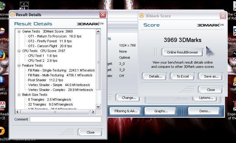 trenutno mi je najveći score 3030 a imam Celeron 2.667@2980,1GB DDR400@298,ABIT AG8,Leadtek PX6600TD @500/675 |