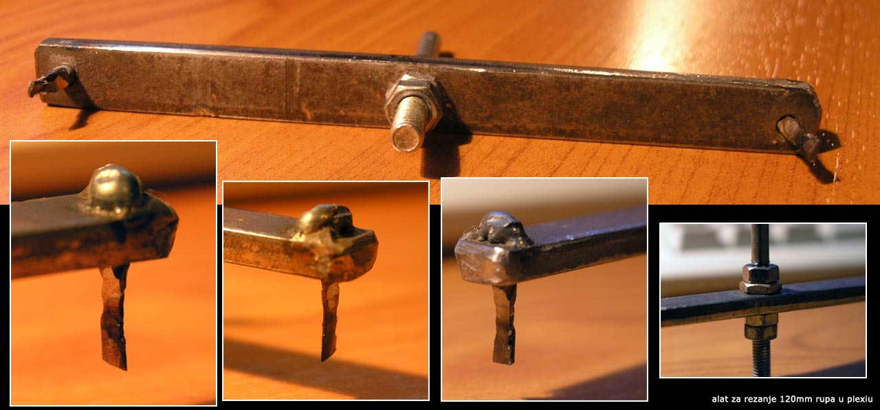 ako imas dremel, mozes rezat njime. Nije bas najprakticnije i najbrze, al je minimalno zagrijavanje. Ja sam rezao sa dijamantnim kotacicem (nije nuzno da bude dijamantni, moze i sa onim za rezanje metala). Uglavnom rezanje 12cm rupe me kostalo 15ak minuta, a potom jos nekih 45minuta sredjivanja rubova, da izgleda okruglo ![]() Nasao sam neku posudu (neznam vise sto je tocno bilo) bas 12cm promjera, stavio na nju smirgl papir, gurnuo u rupu koju sam izbusio, i okretao dok pleksi nije poprimio okrugli oblik posude ![]()