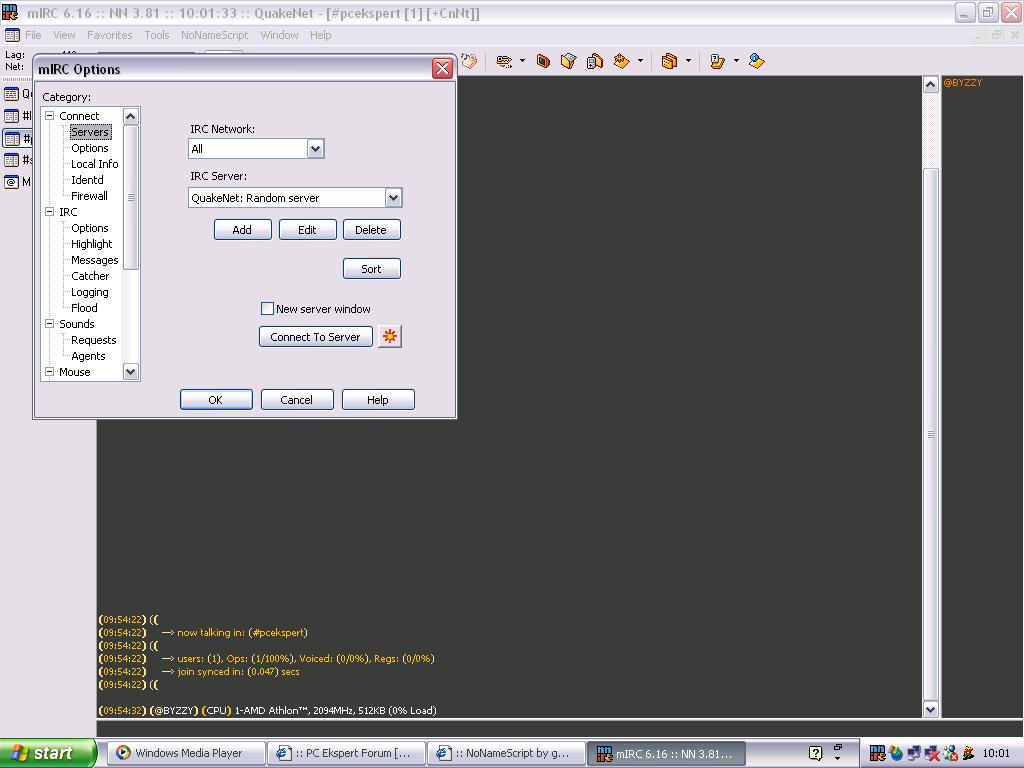Evo,budemo pokusali napraviti kanal na mIRC-u pa ko hoce nek si skine taj program ovdje: mIRC i nnscript za njega Na ovoj stranici prvo skinite mIRC 6.16 pa onda nnscript.. Prvo instalirate mIRC,a onda nnscript u njegov folder (npr. C:/Programfiles/MIRC) Kad sve to napravite onda pokrenite program i podesite sve (nick,e-mail...),i kad to napravite onda izaberite server,evo slike: Kad sve to napravite stavite connect i spojite se na #pcekspert Evo...