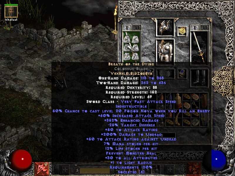 ah diablo 2....koliko sam samo sati potrosio na tu igru (trosim i dalje )trenutno sam 86 lvl sa barbarom. Razocaralo me to sto su stvarno pretjerali sa kolicnnom HP-a kojeg posjeduju kričuri na verziji 1.10. Mislim stvarno su pretjerali. Na 1.09 padali su ko *icke a sad nazalost padaju puno teze. Zalosno je to sto imam najbolji mac u igri (breath of the dying) i sto gotovo da nema enemija koji pada iz prve...strava...sta bi tek bilo da imam neki normalan mac...najbolja kombinacija prstenja je Bul-Kathos' Wedding Band---daje Required Level: 58 +1 To All Skill Levels + (0.5 Per Character Level) 0-49 To Life (Based On Character Level) 3-5% Life Stolen Per Hit (varies) +50 Maximum Stamina (daje na skilove i krade life..savrseno. i drugi Raven frost--- Required Level: 45 +150-250 To Attack Rating (varies) Adds 15-45 Cold Damage, 4 sec. Duration (Normal) Cannot Be Frozen +15-20 To Dexterity (varies) +40 To Mana Cold Absorb 20% ...dalje ..najbolji amulet u igri definitivno je Mara's kaleidoscope---- Required Level: 67 +2 To All Skill Levels All Resistances +20-30 (varies)--(ja imam 30 )+5 To All Attributes btw imam itema da se useres. ... najbolji recept za cupanje itema iz igre je Mephisto party ides samo na njega...pokupis sta je ispalo, save i exit i tako sat-dva..ispadaju unique itemo ko ludi...evo kako izgleda najbolji mac u igri za barbara ( i za ostale)
