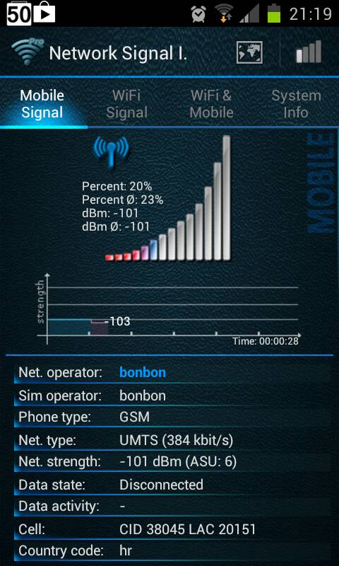 Iskušao sam nekoliko kartica na mobitelu, i očito je problem u t-mobileu. Na slikama se vidi da na Vipu imam odličan signal, na t-mobileu očajan a na bonbonu nešto srednje. Sve tri kartice sam isprobao i na xperia ray telefonu i tamo je Vip imao 100% signal, bonbon preko 80% a moja t-mobile kartica 29%. Zovem službu za korisnike da vidim kaj će mi reći. Edit: razgovarao sam sa službom za korisnike, podnesena je prijava kvara tehničkoj podršci pa će oni sad nešto probati poduzeti, ne znam što.