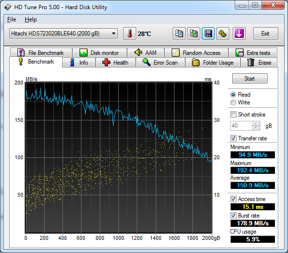 Evo što kažu za disk : Toshibini 3,5-inčni diskovi novost su na tržištu jer je tvrtka postrojenja za njihovu proizvodnju kupila od WD-a. Većina kupljenih postrojenja pripadala je nekoć HGST-u, pa su aktualni Toshibini 3,5-inčni diskovi zapravo preimenovani Deskstarovi starije generacije. Dva najveća modela iz serije DT01ACAxxx temeljeni su na podatkovnim pločama kapaciteta 1 TB, 6 Gb/s SATA sučeljem i 64-megabajtnim cacheom. Deklarirana potrošnja pod opterećenjem od 6,4 W prilično je niska, a potvrđuju je i naša mjerenja radne temperature. Toshibini puleni u testiranju s HD Tuneom bilježe prilično dobre rezultate sekvencijalnog čitanja i pisanja. Gustoća zapisa na pločama nije na razini Seagateovih diskova, no vrlo je visoka. Pristup cacheu brz je kada čitamo, no dosta spor kada se piše. Srećom, čini se da to nije utjecalo na performanse diska pri internom kopiranju podataka. U AS-SSD-u obje Toshibe tako bilježe odlične rezultate s kojima se mogu mjeriti tek skupi, bučni i rastrošni diskovi iz WD-ove serije RAID Edition. Vrlo pozitivan dojam nastavlja se kod testiranja s PCMarkom, u kojem diskovi japanskog proizvođača zauzimaju vrlo dobre pozicije. Konkretno, ispred manjeg modela samo su dva WD-ova diska (RE i Black), dočim je veći na vodećoj poziciji. Ono što Toshibinim diskovima nedostaje za našu bezrezervnu preporuku jest dulje jamstvo. Premda je dvije godine manje-više standard za sve “obične” diskove,konkurencija sličnih performansi nudi više. S druge strane, Toshibe su i jeftinije, što je u današnje vrijeme teško zanemariti. Disk mi je stigao pa sam odmah napravio test . Evo SS koji pokazuje da je disk prilično brz ! |
