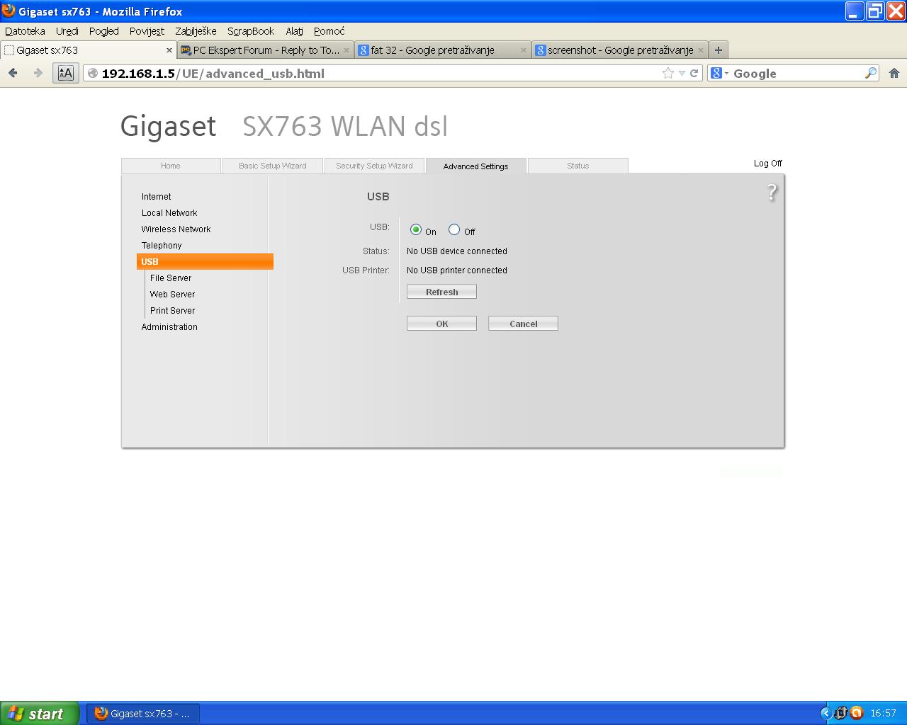 Dobri ljudi molim pomoć. Pokušavam napraviti File server ali modem nikako neće očitati USB stick. Kad ubacim stick ne upali se ni LED dioda koja bi trebala signalizirati da je stick spojen na USB. U system log-u vidim da je modem skužio da je USB stick spojen ali ne prepoznaje particiju i file system. Stick je 8 GB a file system je FAT32, i ima samo jednu particiju-primary. Molim recite što napraviti. Modem sam još davno otključao po uputama na ovom forumu. Na modemu je Firmware version: 4.3.52.21.01, Bootcode version: Primary: 4.1.24.52.12 Secondary: 4.1.28.52.12 Configuration file version: 284714-12_DCFG_BL-52.11.300_TRIPLE_PLAY evo kako to izgleda: a evo i ispisa System Log-a : Jan 4 18:41:54 Err Jan 4 18:41:54 War Jan 4 18:41:54 War Jan 4 18:41:54 Err Jan 4 18:41:54 Err Jan 4 18:41:54 War Jan 4 18:41:54 War Jan 4 18:41:54 Err Jan 4 18:41:54 Err Jan 4 18:41:54 War Jan 4 18:41:54 War Jan 4 18:41:54 Err Jan 4 18:41:54 Err Jan 4 18:41:54 War Jan 4 18:41:54 War Jan 4 18:41:54 Err --- Zadnje izmijenjeno od: MikiCool. 02.04.2013. u 18:40. |