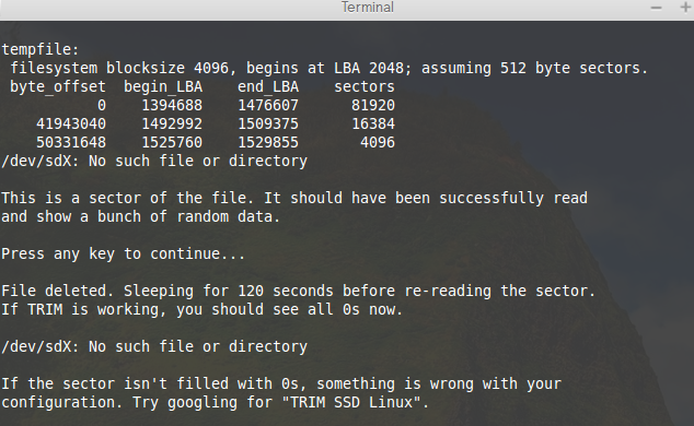Izgleda da je po defaultu trim na samsungovom ssdu upaljen.. https://sites.google.com/site/lightr...bledandworking Okinul sam ovu skriptu, ali... Trebal bi dobit ovo: If TRIM is properly working the result of the last command should be a bunch of zeros.. Al u mom slučaju ko da nekaj ne štima, prva slika... Dok pokrenem u terminalu, sudo fstrim -v / /: 1129930752 bytes were trimmed Poovom bi ispalo da radi...hmmm EDIT: Pokrenul sam i ovo: Become root: sudo -i Make a 50MB file with random data: dd if=/dev/urandom of=tempfile count=100 bs=512k oflag=direct Check the starting LBA address of the file: hdparm --fibmap tempfile Read the first address of the file, note that you need to put the first LBA in place of [ADDRESS]: hdparm --read-sector [ADDRESS] /dev/sdX Now remove the file and synchronize the filesystem: rm tempfile sync Use the same command as in 4 to re-read the LBA: hdparm --read-sector [ADDRESS] /dev/sdX Al i tu nekaj ne štima, druga slika.. Zadnje izmijenjeno od: zvonac. 04.07.2014. u 18:56. |