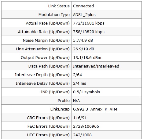 Ne kužim se previše u dijagnostiku al pretpostavljam da mi je linija danas u puno gorem stanju neg prije dva tjedna....Može objašnjenje - noise margin bi trebao biti što veći (dB), jel? Prije dva tjedna nisam imao doslovno ni jednu grešku a danas je sve puno..... Prije dva tjedna: Link Status Connected Modulation Type ADSL_2plus Actual Rate (Up/Down) 782/12276 kbps Attainable Rate (Up/Down) 1357/26756 kbps Noise Margin (Up/Down) 26.8/20.1 dB Line Attenuation (Up/Down) 2.1/6 dB Output Power (Up/Down) 13.1/12.7 dBm Data Path (Up/Down) Interleaved/Interleaved Interleave Depth (Up/Down) 2/224 Interleave Delay (Up/Down) 2/4 ms INP (Up/Down) 0.5/2.5 symbols Profile N/A LinkEncap G.992.3_Annex_K_ATM CRC Errors (Up/Down) 0/0 FEC Errors (Up/Down) 0/0 HEC Errors (Up/Down) 0/0 Danas je ovo dolje sa slike....... Što se moglo dogoditi? THANKS ![]() |