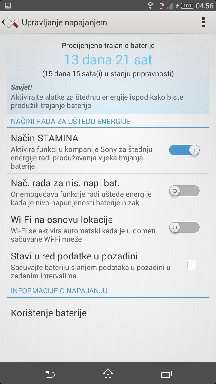 napunih mob do kraja i vecinom je bio na stand by, te trenutno pokazuje u stamina modu 15 dana aktivno i 21 dan u stand by modu, a baterija nakon 2 dana i 4,5 sata je na 84%.....screen upaljen 1 sat.... sad sam tek ubacio 3 g kartice pa cu vidjeti hocu li biti zadovoljan sa ovim mobitelom....inace nisam ljubitelj sonija, pa cu bas vidjeti jesam li bio u pravu....vise preferiram samsung ali zbog previsoke cijene i vrazjeg spijunskog fingerprint skenera na petici nisam ga kupio.... ono sto sam primijetio je da je kamera zivo sranje kada je upaljen blic..........slika ispadne uzas..... Zadnje izmijenjeno od: tor. 17.11.2014. u 08:21. |