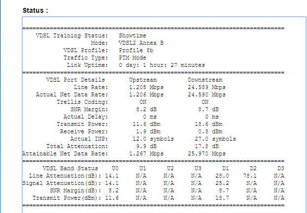 OK ... kaj su sada zbimbali ? Ovo je prije: VDSL Port Details Upstream Downstream Line Rate: 5.119 Mbps 29.433 Mbps Actual Net Data Rate: 5.120 Mbps 29.434 Mbps Trellis Coding: ON ON SNR Margin: 17.2 dB 8.0 dB Actual Delay: 0 ms 0 ms Transmit Power: 6.4 dBm 18.5 dBm Receive Power: 0.1 dBm 3.1 dBm Actual INP: 12.0 symbols 27.0 symbols Total Attenuation: 7.0 dB 15.4 dB Attainable Net Data Rate: 8.841 Mbps 29.633 Mbps ============================================================================ VDSL Band Status U0 U1 U2 U3 D1 D2 D3 Line Attenuation(dB): 10.1 43.7 N/A N/A 21.0 56.8 N/A Signal Attenuation(dB): 10.1 42.7 N/A N/A 18.1 57.0 N/A SNR Margin(dB): 17.1 17.2 N/A N/A 7.9 8.1 N/A Transmit Power(dBm):- 3.4 5.9 N/A N/A 18.3 5.4 N/A a ovo je sada: VDSL Port Details Upstream Downstream Line Rate: 0.813 Mbps 12.139 Mbps Actual Net Data Rate: 0.793 Mbps 12.140 Mbps Trellis Coding: ON ON SNR Margin: 8.2 dB 8.4 dB Actual Delay: 3 ms 0 ms Transmit Power: 5.3 dBm 18.4 dBm Receive Power: 0.0 dBm 0.5 dBm Actual INP: 0.5 symbols 26.0 symbols Total Attenuation: 6.3 dB 17.9 dB Attainable Net Data Rate: 0.797 Mbps 12.056 Mbps ============================================================================ VDSL Band Status U0 U1 U2 U3 D1 D2 D3 Line Attenuation(dB): 18.2 57.2 N/A N/A 30.2 70.8 N/A Signal Attenuation(dB): 18.2 54.7 N/A N/A 27.1 N/A N/A SNR Margin(dB): 8.0 8.2 N/A N/A 8.4 N/A N/A Transmit Power(dBm): 1.4 3.0 N/A N/A 18.5 N/A N/A koju kiflu su petljali ?